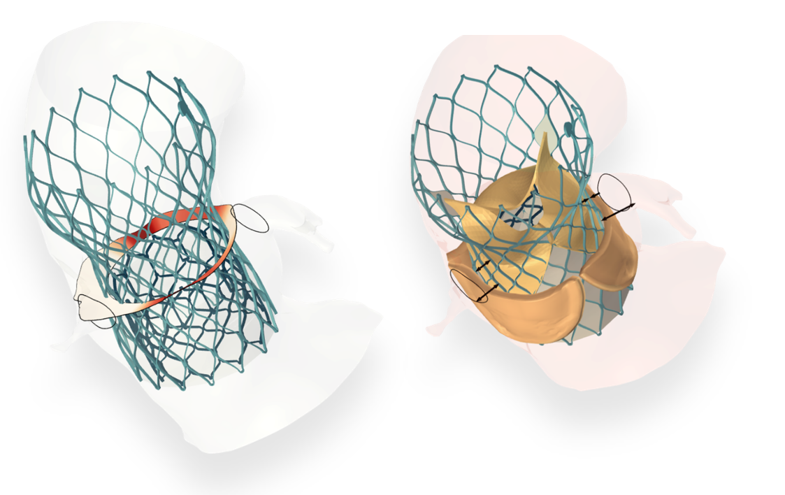 The skirt apposition will provide valuable insight in the sealing of the device to the anatomy, and the contact area indication will provide a qualitative insight on the contact of the device in the region of the conduction system.  No quantitative evaluation of PVL nor contact pressure index is provided in the new release of FEops HEARTguide™*.